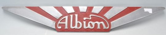 Castrol - an original retro vintage enamel type double sided advertising sign for Castrol oil. Squared base, with apex top, with notation in red and white to both sides. Mounting holes to corners. Wonderful piece of garage advertising. Measures: 23cm x 48cm. Together with a rare original vintage 1950's Albion Motors aluminium cast ' Albion ' Wagon / Lorry radiator topper plaque. Winged form, with enamel painted red ' Albion ' notation and sun rays. Cast registration number to rear.Rare item from early haulage vehicles. Measures: 78cm.