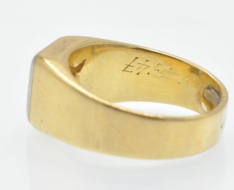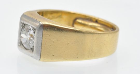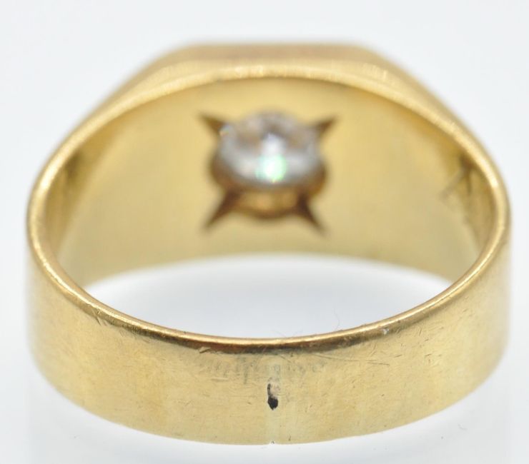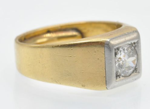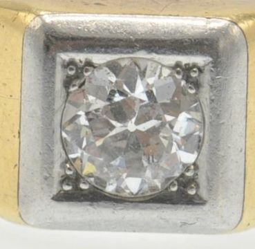 An antique 18ct gold platinum and diamond solitaire ring. The ring set with a round brilliant cut diamond in a prong and bezel setting in a square raised mount. Marked - inscribed numbers to inner shank. Tests indicate 18ct gold and platinum. Estimated diamond weight 0.90ct. Weight 13.8g. Size P/7.5/56.