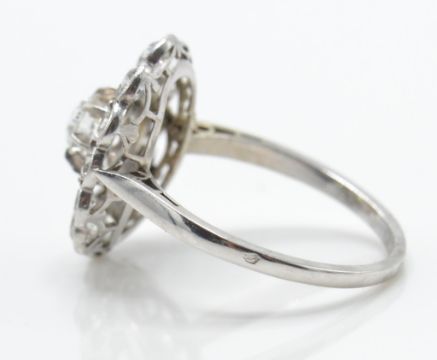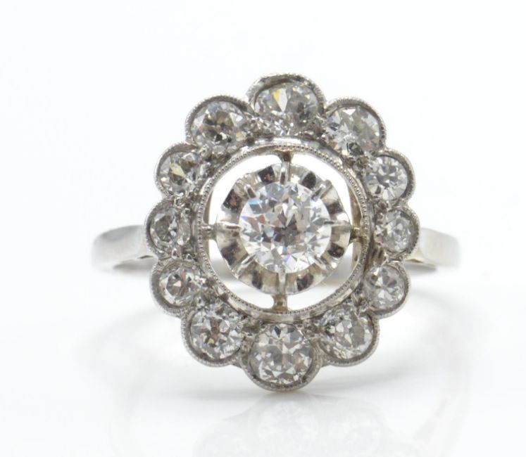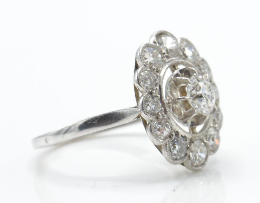 An 18ct white gold and diamond cluster ring. The ring set with a central round brilliant cut diamond in a raised prong setting surrounded by a halo of diamonds tapering shoulders. French eagle mark to outside of shank. Weight 3.4g / SIze N