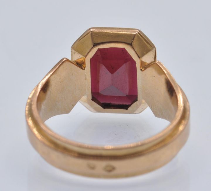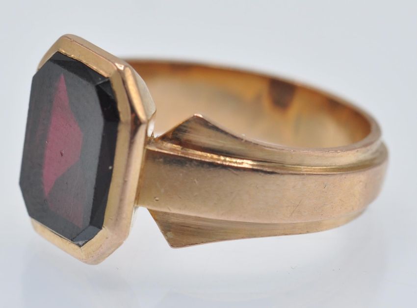 A French 18ct gold and garnet signet ring. The ring set with a flat cut garnet in an octagon shaped mount to stylised shoulders and shank. French eagle assay mark to shank with sponsor mark. Head measures 14mm x 12mm. Weight 10.1g. Size S / 9 / 60.