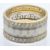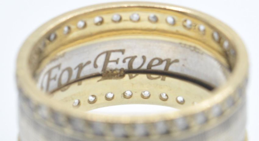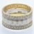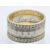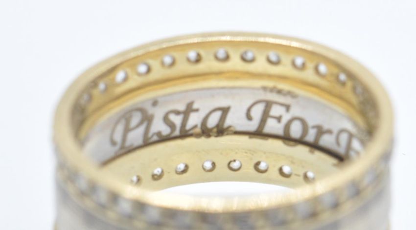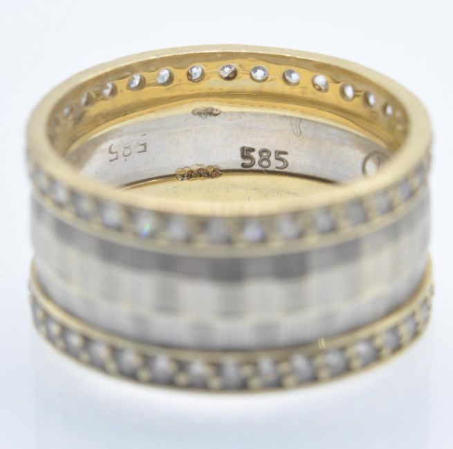 A 14ct white and yellow gold band ring. The ring having borders of yellow gold and colourless stones framing a central textured chequered channel. Marked 585 Engraved 'Pista For Ever'. Weight 5.1g. Size M.5 / 6.5/ 53.