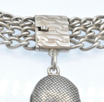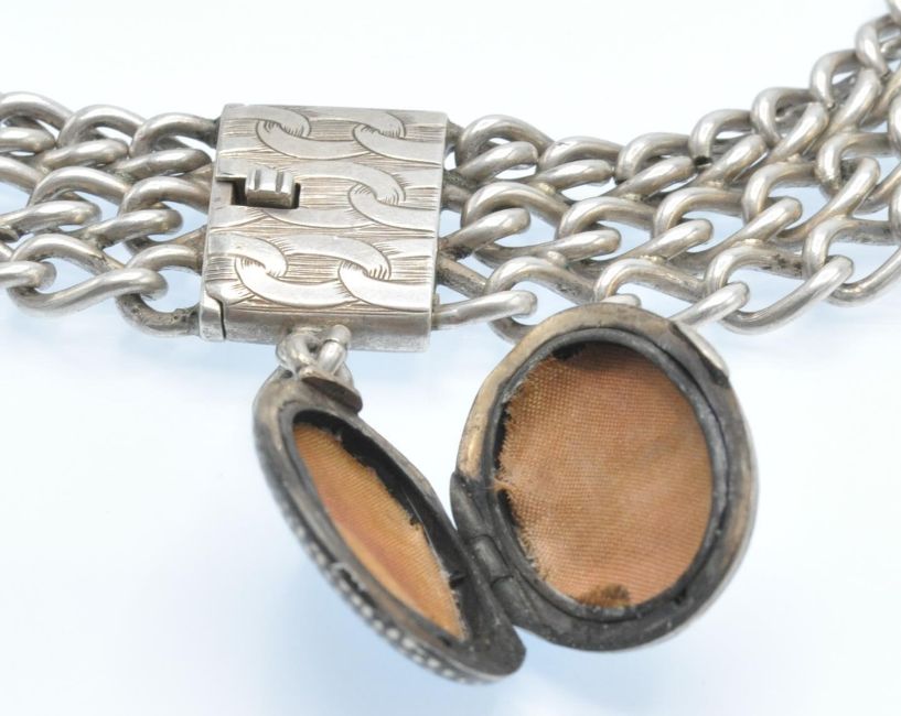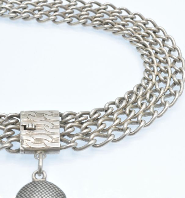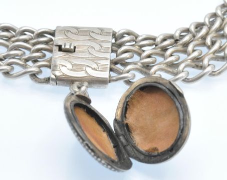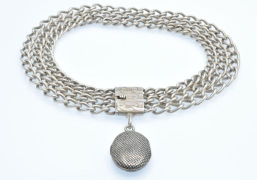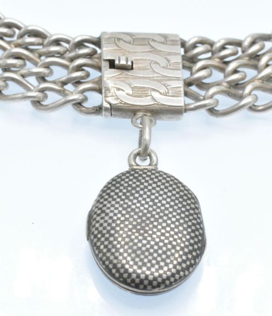 A silver locket choker necklace. The necklace strung with a silver niello chequer decorated locket, strung upon a triple chain choker necklace having a stylised chain decorated clasp. Weight 110g. Measures 14.5 inches. Chain width approx 2cms.