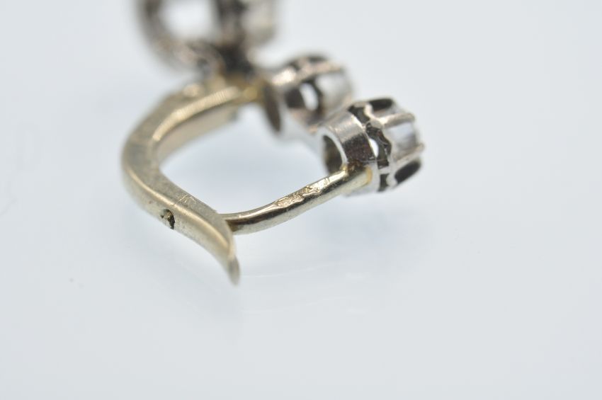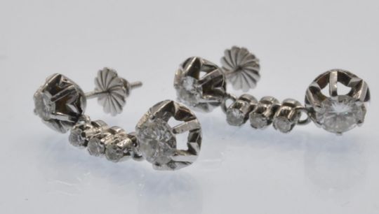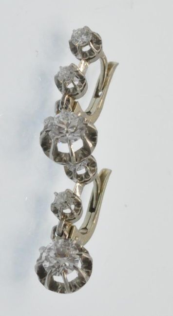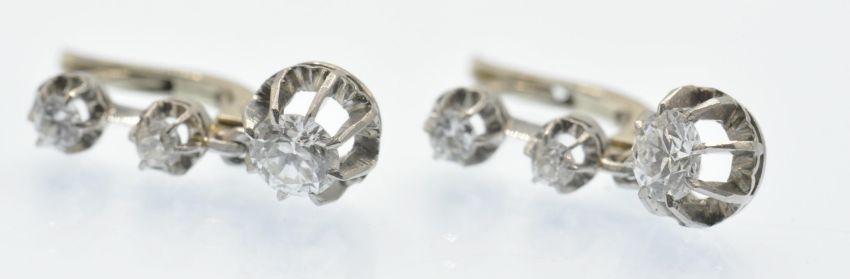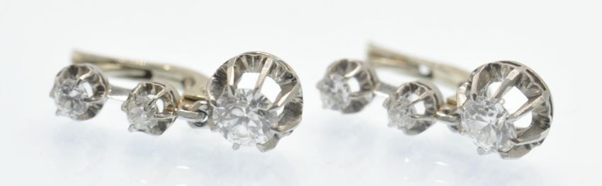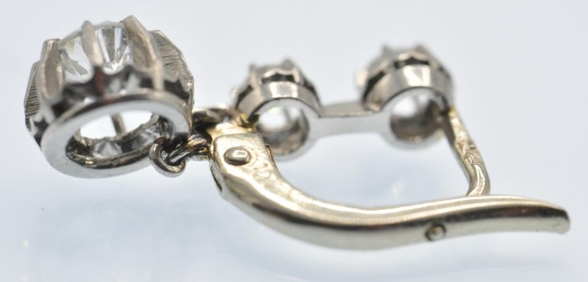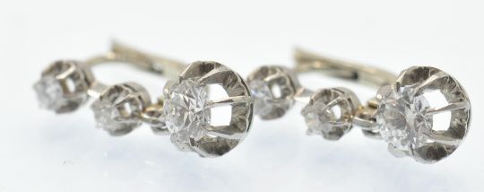 A pair of antique French 18ct white gold and diamond 3 stone drop earrings. The earrings set with three round brilliant cut diamonds, in scalloped prong settings, within diamond cut mounts, to lever post fasteners. Marked - French eagle assay mark, bigorne mark to fastener. Estimated total diamond weight 0.30ct 0.5ct 0.5ct each, total 0.80ct. Weight 3.2g Measures 1.5cm drop.