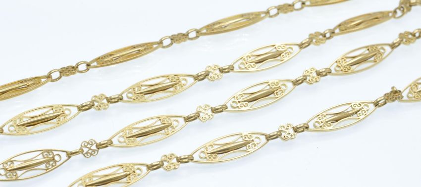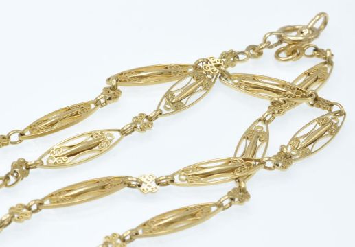 A French 18ct gold antique guard chain. The chain having pierced navette shaped links with central torpedo and pierced scrolls, completed with dog and spring hoop clasp. Marked French assay marks eagle and bigorne and clasp. Measures approx 150cms. Weight 85.8g.
