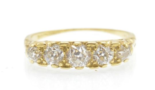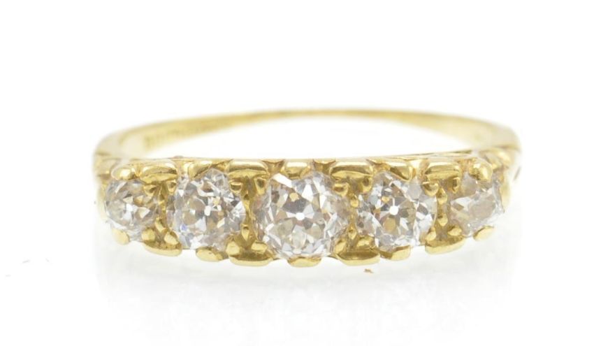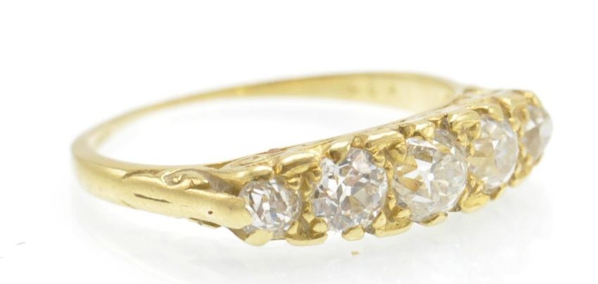 An antique hallmarked 18ct gold and diamond 5 stone ring. The ring set with five graduated old cut diamonds within a pierced and scrolled mount having decorated shoulders to tapered shank. Hallmarked London. Estimated total carat weight 1.10ct. Size O / 7 / 55. Total weight 3.2g.