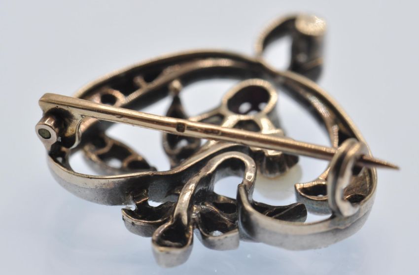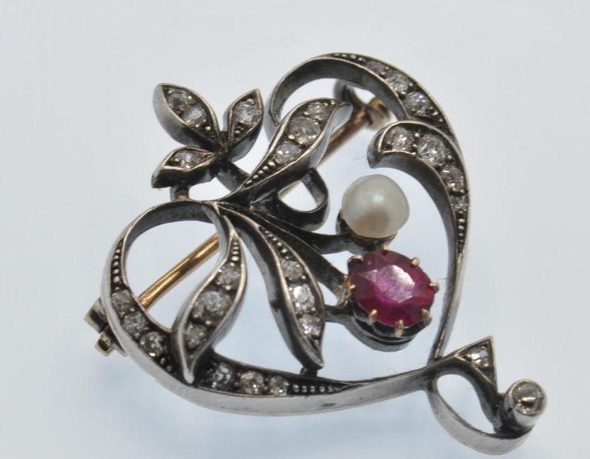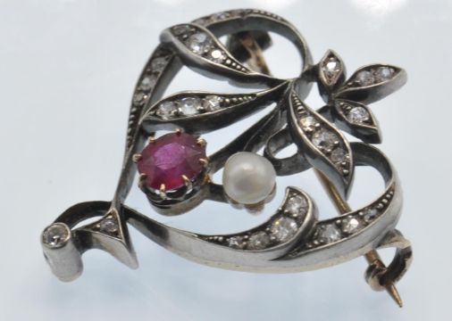 A antique ruby diamond and pearl brooch pin . The brooch having an open work Belle Époque heart design of diamond set foliates and a central oval mixed cut ruby together with a pearl.  C clasp and pin verso. Marks to clasp and pin. Measures 3cms. Weight 6.6g.