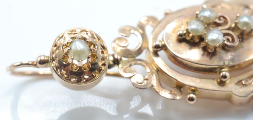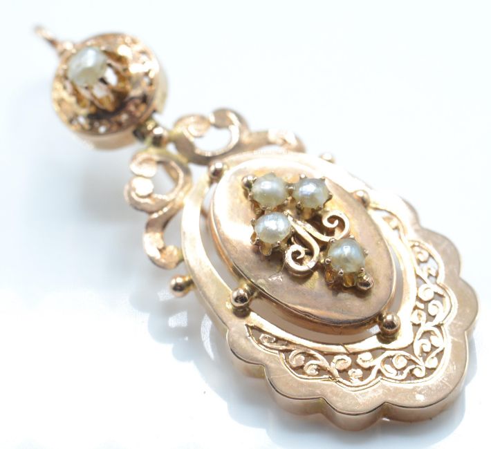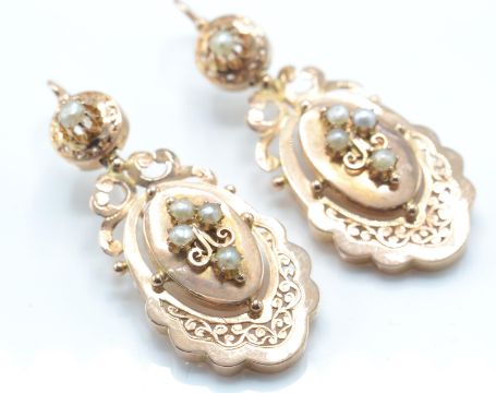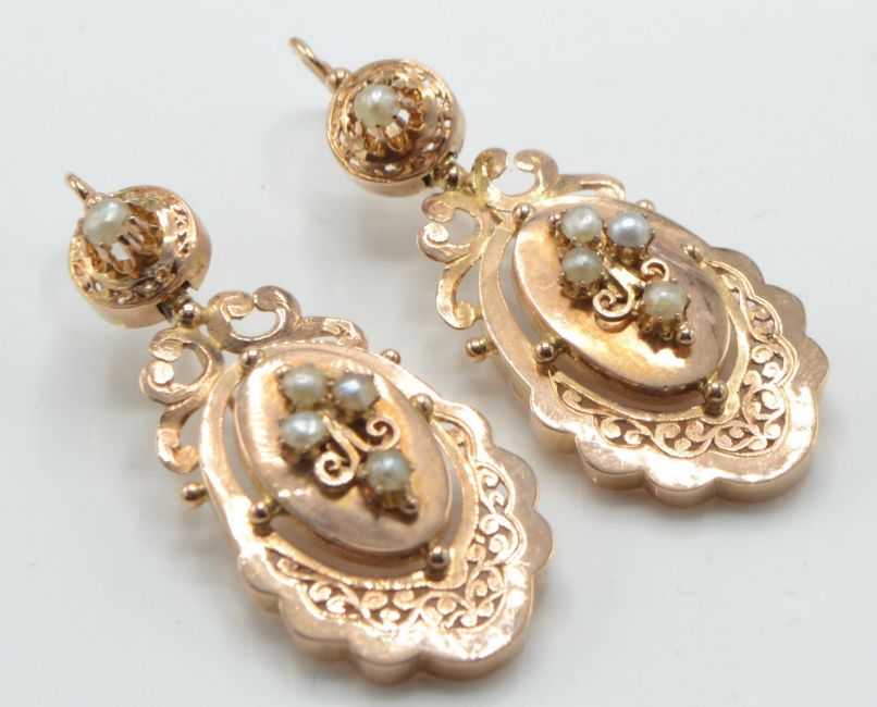 A pair of French 18ct rose gold and pearl drop earrings. The earrings having pierced scrolled open work drops set with pearls surmounted by pierced roundel with pearl stud completed by fish hook fasteners. French eagle mark to fastener. Total weight 6.3g / Size 4cms drop