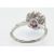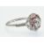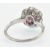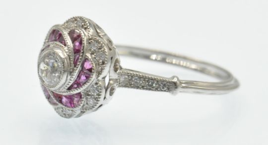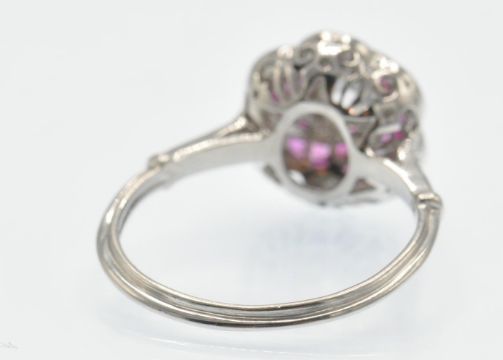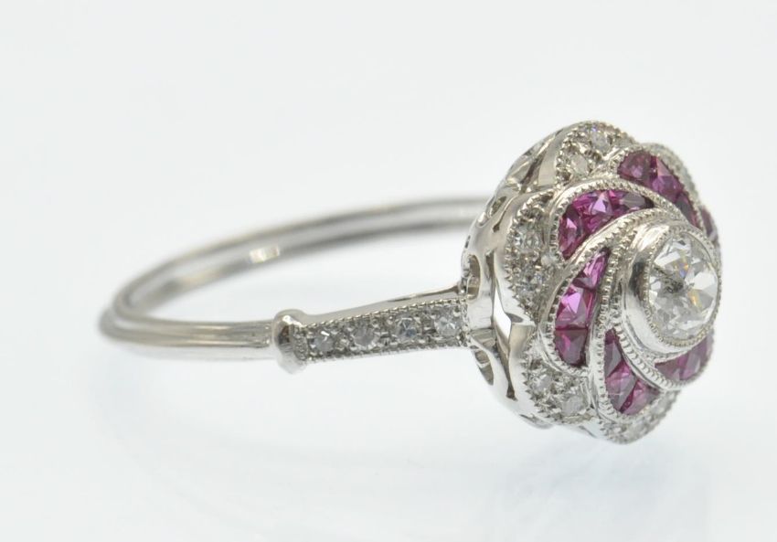 A platinum ruby and diamond ring. The ring set with a central round brilliant cut diamond and calibre ruby in a floral cluster mount with diamond set shoulders and reeded shank. Weight 4.6g. Estimated total diamond weight 0.40ct, principal diamond 0.20ct.  Size 0 / 7/ 55.