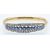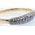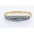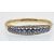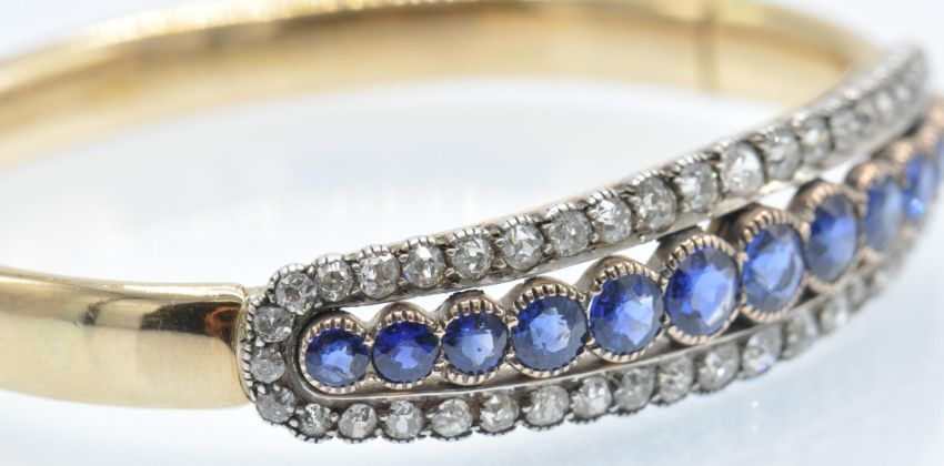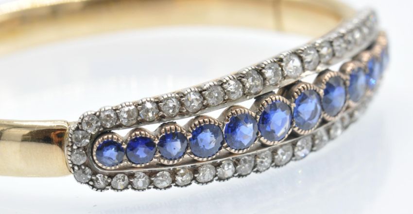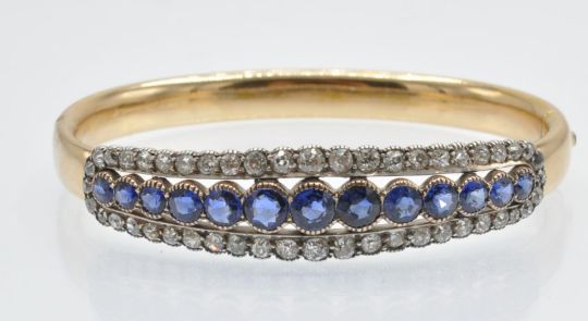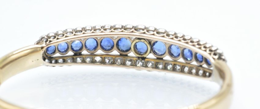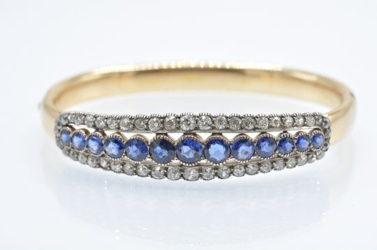 A Victorian gold sapphire and diamond bangle. The bangle being set with graduated round mixed cut sapphires framed by graduated old cut diamonds.  Unmarked tests indicate gold. Principle central sapphire 4.7mm x 2.7mm.  Estimated total diamond weight 2.5ct.  Weight 17.9g. Measures internal circumference approx 7inches.