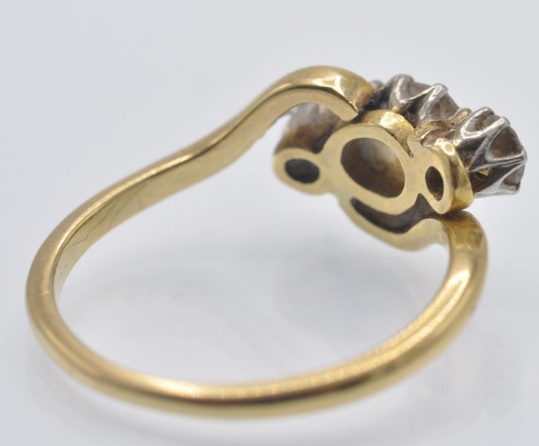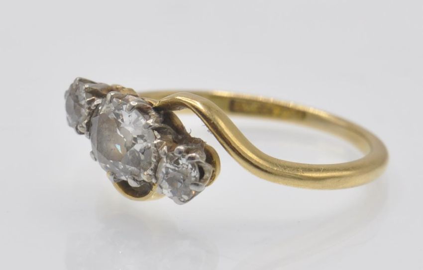 An 18ct gold, platinum and diamond three stone ring. The ring set with old oval and round cut diamonds in a crossover setting. Marked 18ct &Plat.  Estimated diamond weight 0.80ct. Weight 3.2g. Size O/7/55.