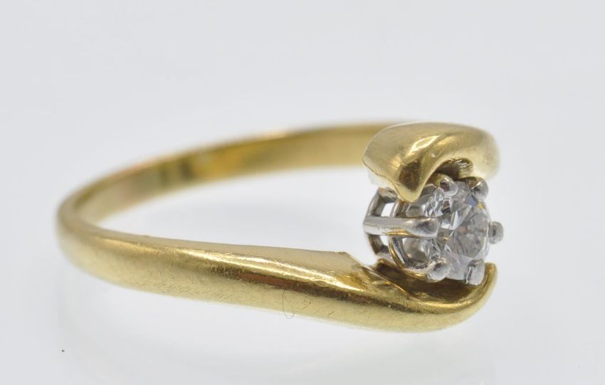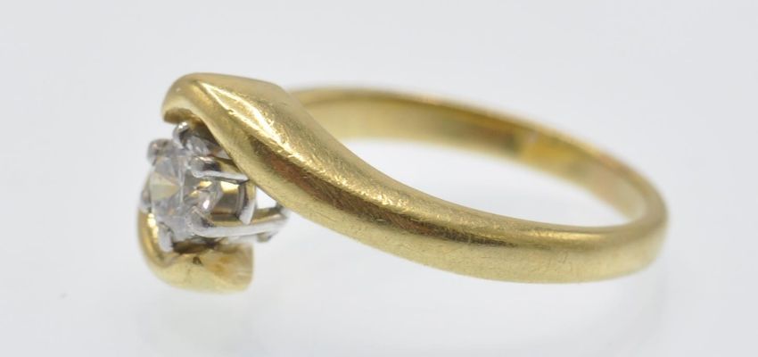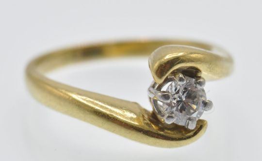 An 18ct gold and diamond solitaire crossover ring. The ring set with a round brilliant cut diamond of approx 0.25cts in a substantial 18ct gold crossover mount. Un marked tests 18ct gold. Weight 4.1g. Size I.