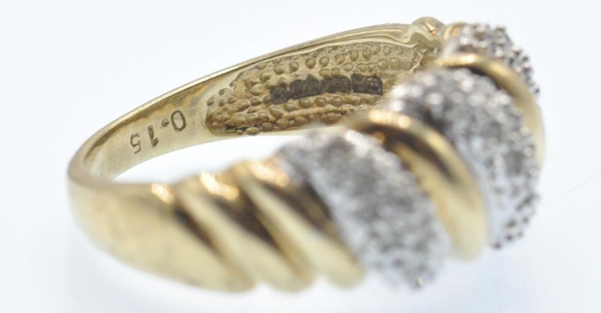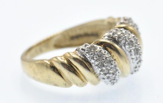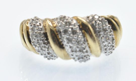 A hallmarked 9ct gold and diamond dome ring. The ring set with alternating pavé set diamonds and gold arcs. Estimated diamond weight 0.15ct. Weight 3.7g. Size L.