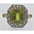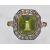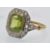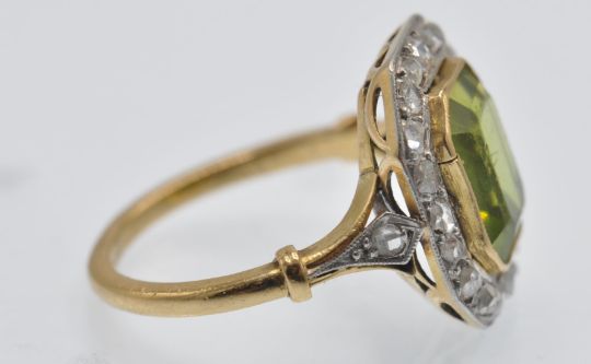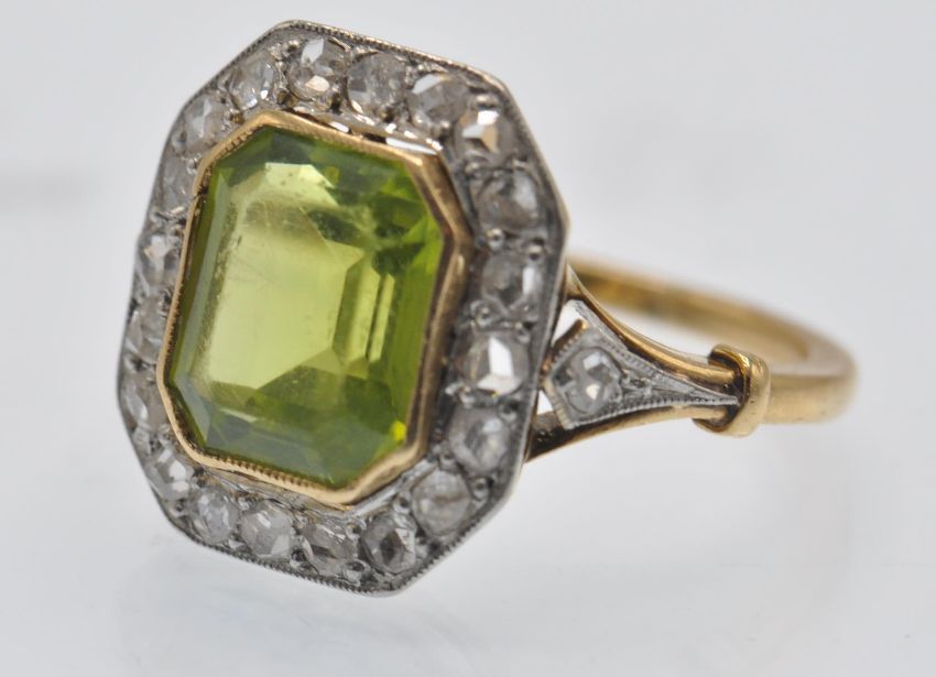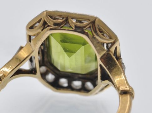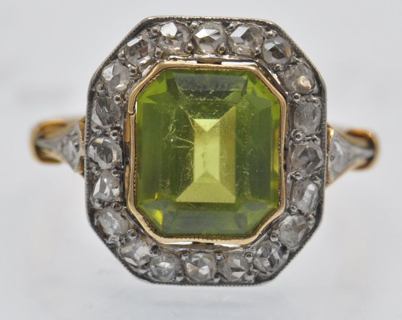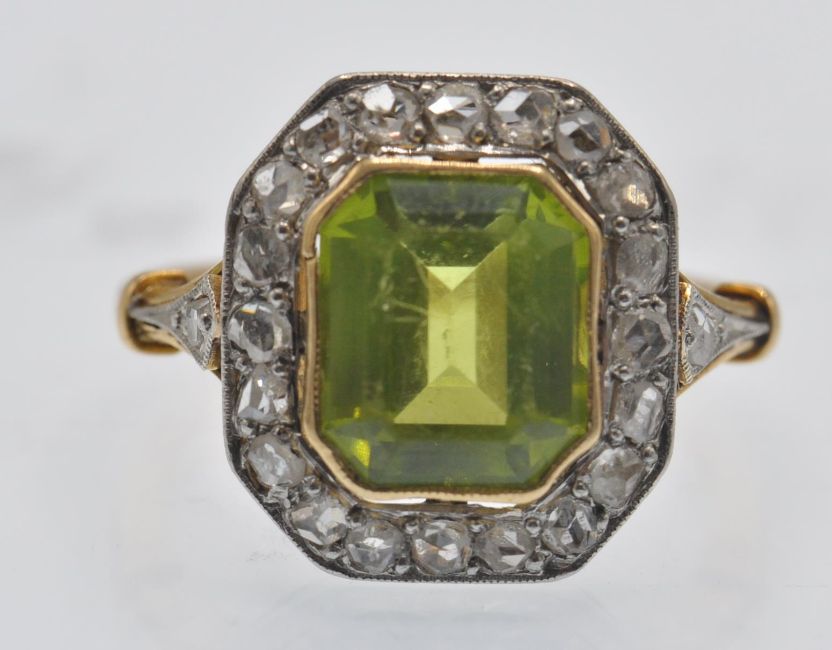 An antique gold peridot and diamond cluster ring. The ring set with an emerald cut peridot, framed by a border of rose cut diamonds having pierced foliate diamond set shoulders. Head measures approx 14.5mm x 13mm.  Weight 3.6g. Size J.5 / 5/ 50.