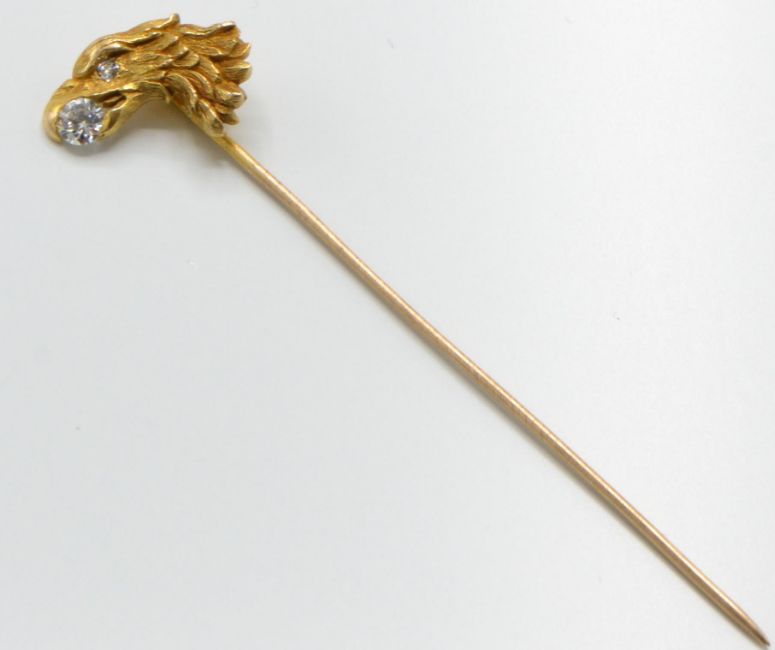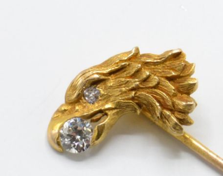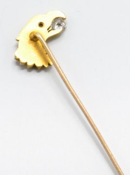 An 18ct gold and diamond figural eagle stick pin. The stick pin having an eagle head motif with diamond inset to beak and diamond set eye. Estimated diamond weight 0.33cts to beak and 0.03cts for the eye. Total weight 3.2g / Measures 8cms