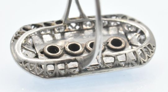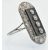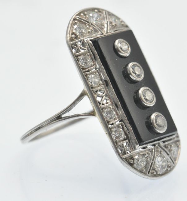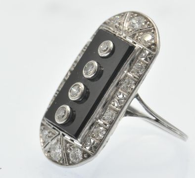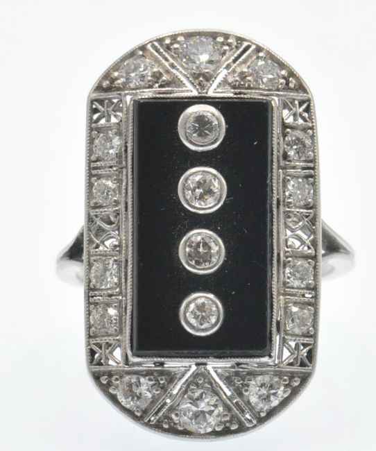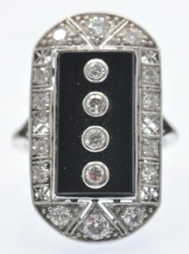 A platinum onyx and diamond plaque ring. The ring set with four round brilliant cut diamonds within a black onyx plaque framed by a pierced geometric diamond set mount to reeded shank. Estimated diamond weight 1ct. Head measures 2.5cms x 1.5cms. Weight 6g. Size M.5 / 6.5/53.