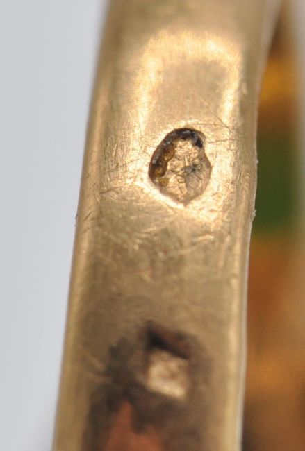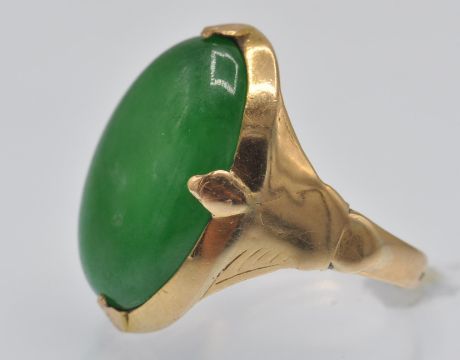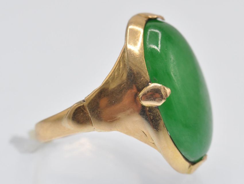 A French 18ct gold and jade cabochon ring. The ring having a bezel and four claw set green Jade cabochon. Marked - French Eagle assay mark and makers mark to outside of shank and further marks to inside of shank which look to be of Chinese origin. Cabochon measures 21mm x 16mmx 4.6mm. Weight 8.2g. Size R / 8.5/ 58.5.