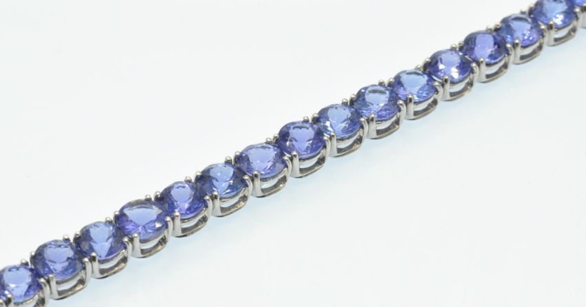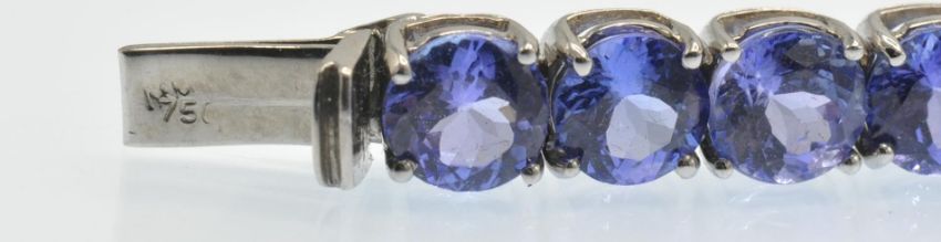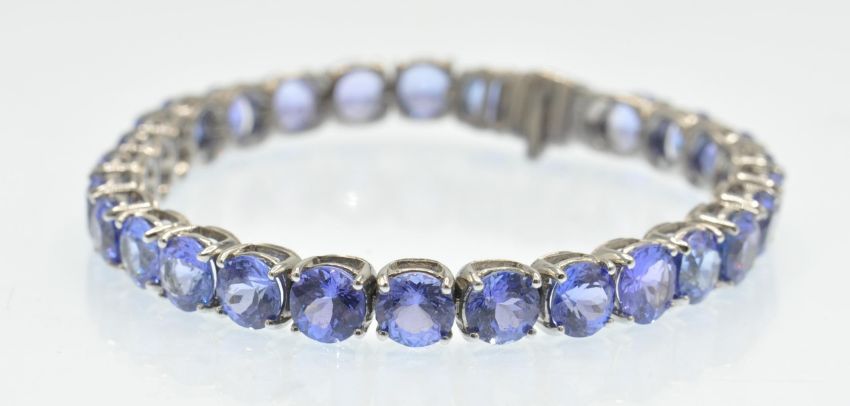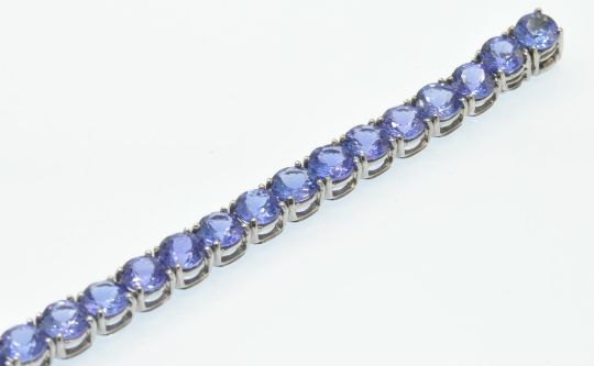 An Italian 18ct white gold and tanzanite tennis bracelet. The bracelet being set with 28 round mixed cut tanzanite. Estimated weight tanzanite 28ct. Total weight 31.5g. Measures 7 1/2 inches / 19cms.