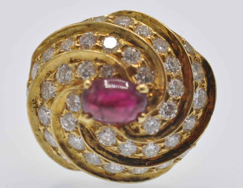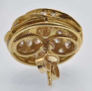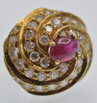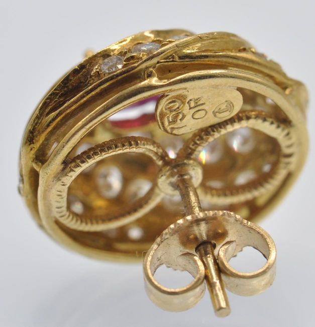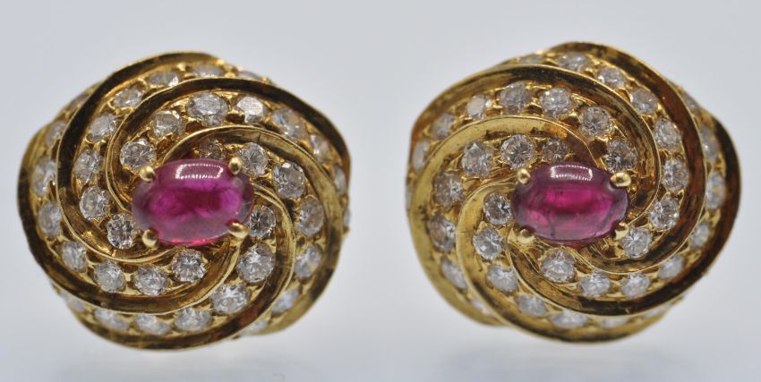 A pair 18ct gold of ruby and diamond earrings. The earrings having a central ruby cabochon, surrounded by fluted channels of round brilliant cut diamonds. The earrings completed with post backs with butterfly fasteners. Estimated total diamond weight 1ct. Marked OR 750 , butterfly backs 14k, makers mark. Weight 7.7g. Measures 16.1 mm x 14.1mm.