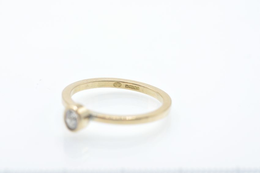 A hallmarked contemporary 18ct gold solitaire diamond ring. The ring having an oval cut diamond in a bezel setting to plain band. Hallmarked London . Estimated diamond weight 0.10ct. Weight 2.8g. Size O / 7/ 55.