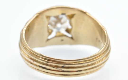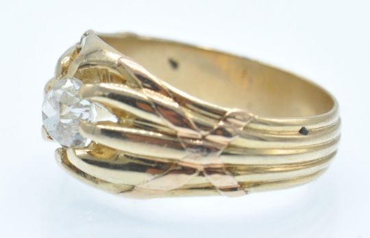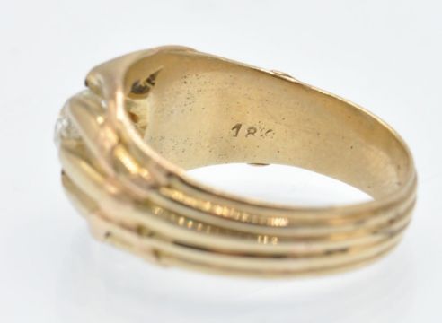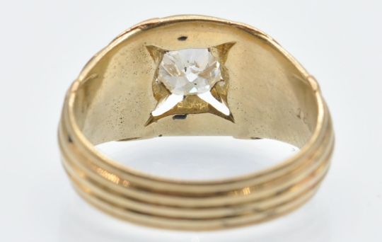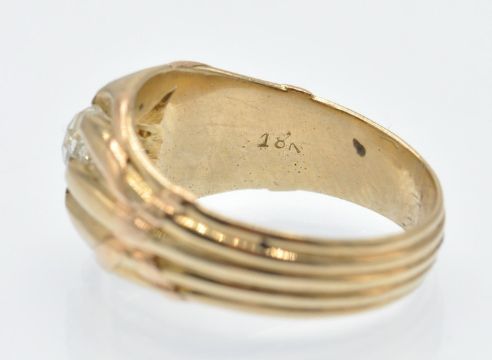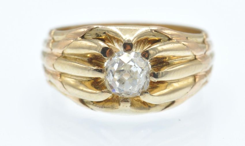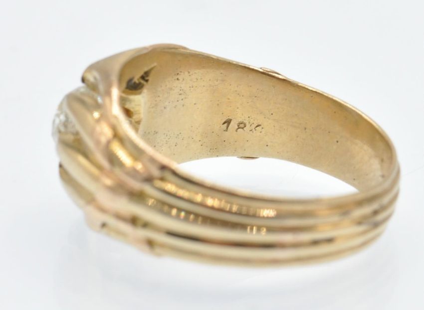 An antique 18ct gold and diamond ring. The ring set with an old cut diamond in a scalloped prog setting having x motif shoulders to reeded shank likely French. Marked 18. Tests indicate 18ct gold. Estimated diamond weight 0.80 - 1ct. Weight 9.0g Size R / 8.5 / 58.5