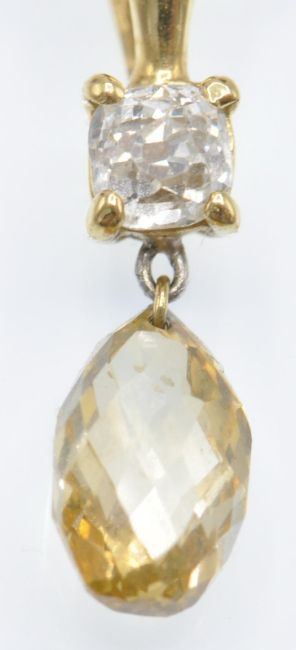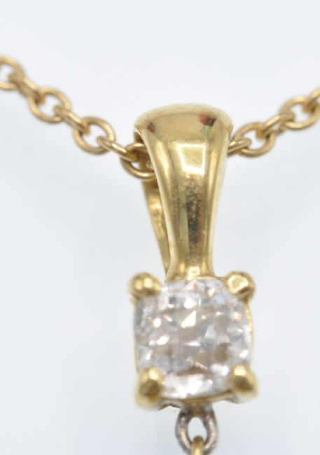 An 18ct Gold & Diamond Pendant necklace. The necklace strung with a fancy yellowish gold briolette cut diamond drop surmounted by an old cut diamond, upon a fine gold chain. The chain marked 750. Measures chain 17 3/4 inches. The pendant  1.7cm drop. Total weight 3g.