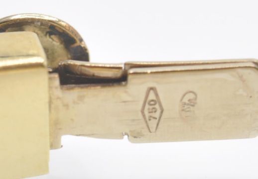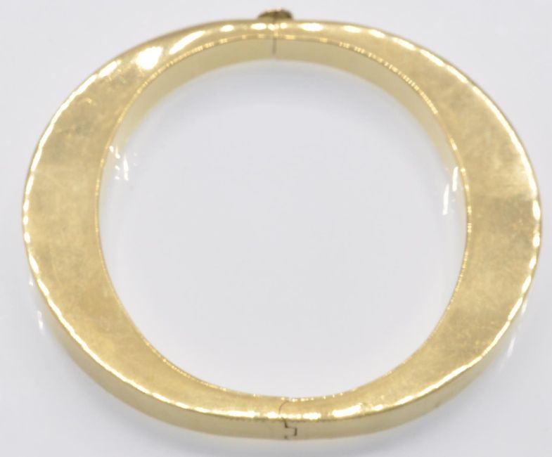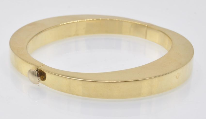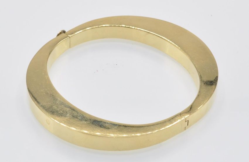 A French designer 18ct gold bracelet bangle. The bangle in the shape of the letter O with button clip clasp. Marked - French assay  eagle marks x 2 to clasp , 750, makers mark. Weight 27.9g. Measures approx 6.5 inches inner.