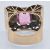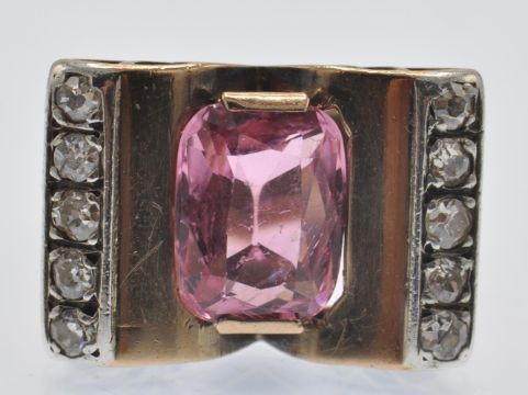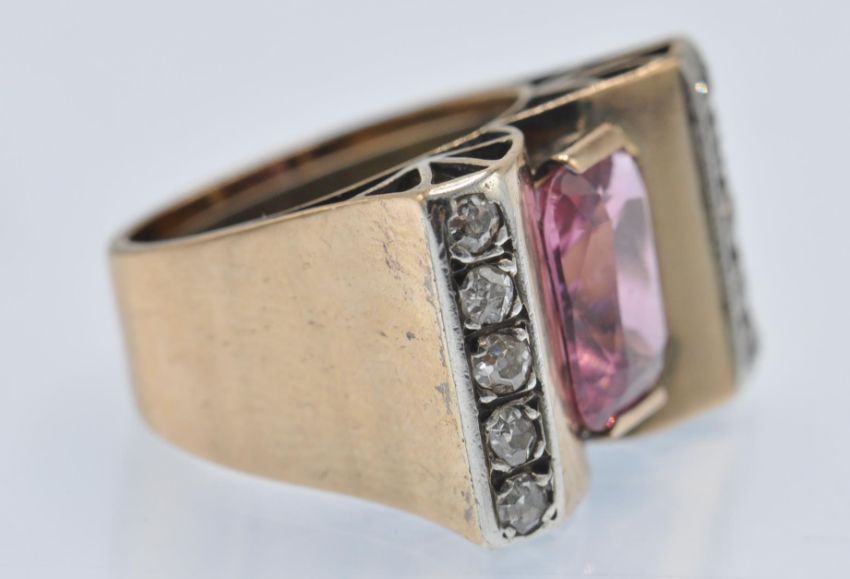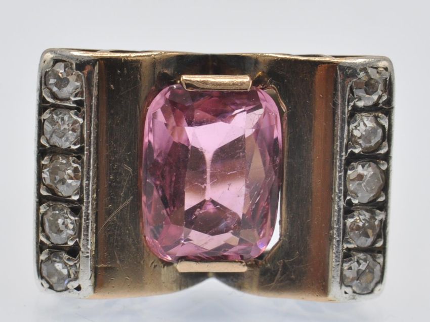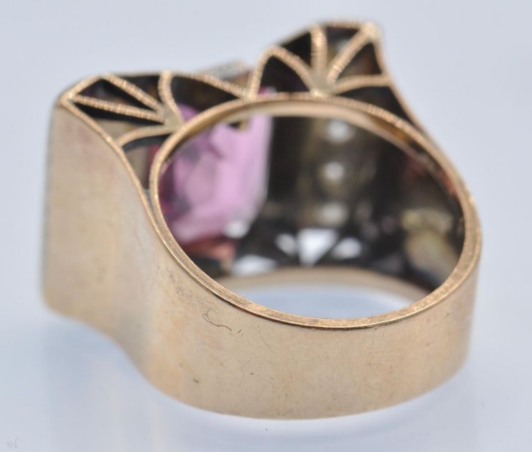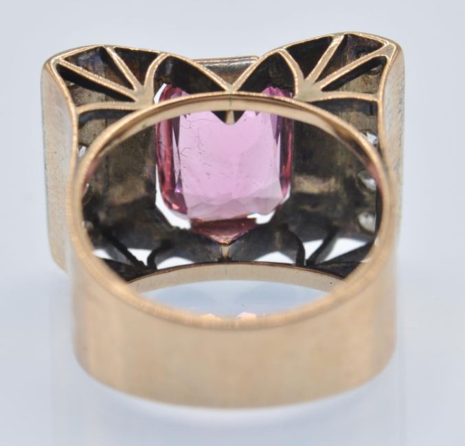 A retro rose gold tourmaline and diamond ring. The ring having an arching architectural spoked mount set with a central oval mixed cut pink tourmaline framed by two rows of old cut diamonds. Unmarked - tests indicate gold. Tourmaline measures approx 10mm x 8mm. Weight 6.2g. Size J.5 / 5 / 49.5.