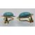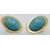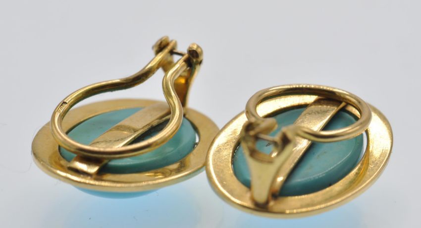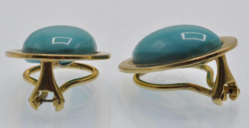 A pair of 18ct gold and turquoise earclips. The earrings having a large bezel set oval turquoise cabochon in a plain 18ct gold mount to clip fasteners. Marked 750 to clip and fastener. Measures - Turquoise 17mm x 12.5mm Earclip  22.5mm x 17.5mm. Weight 9.7g.