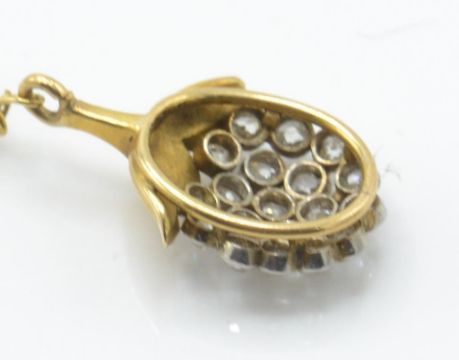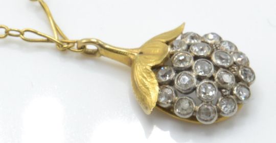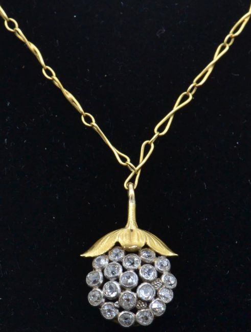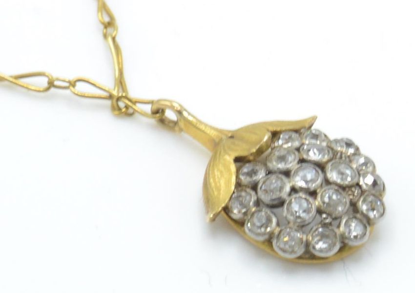 An 18ct gold and diamond pendant necklace. The necklace strung with a pendant in the form of a berry being set with a  cluster of bezel set brilliant cut diamonds. Strung upon a fancy link chain. French eagle mark to the bale. Weight 4.2g / Chain size 19" / pendant drop 2cms approx