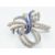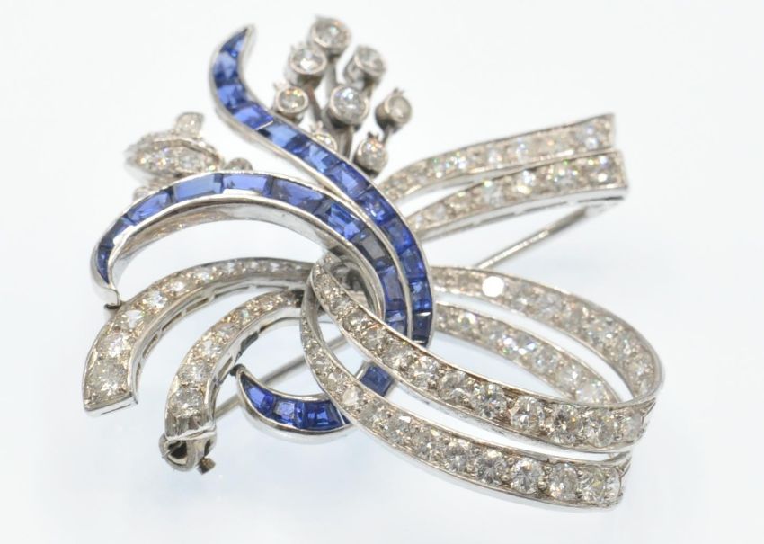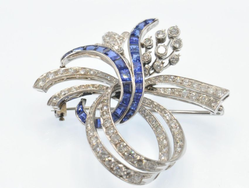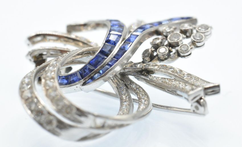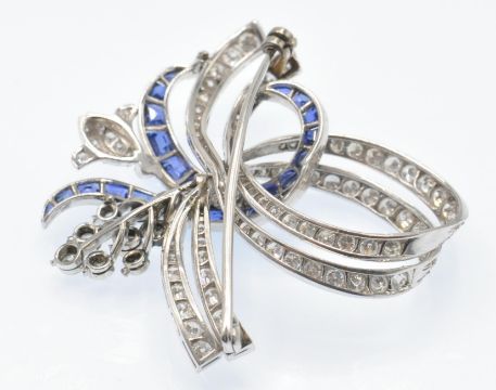 A platinum sapphire and diamond brooch pin. Brooch in the form of a floral spray tied with ribbons set with prong and bezel set round brilliant cut diamonds and calibre cut sapphires. Weight 16.5g. Estimated diamond weight 2.5ct. Measures approx 1 3/4 inches.
