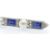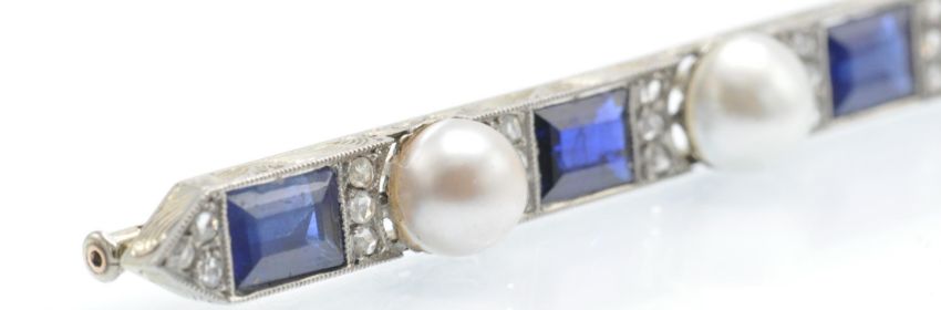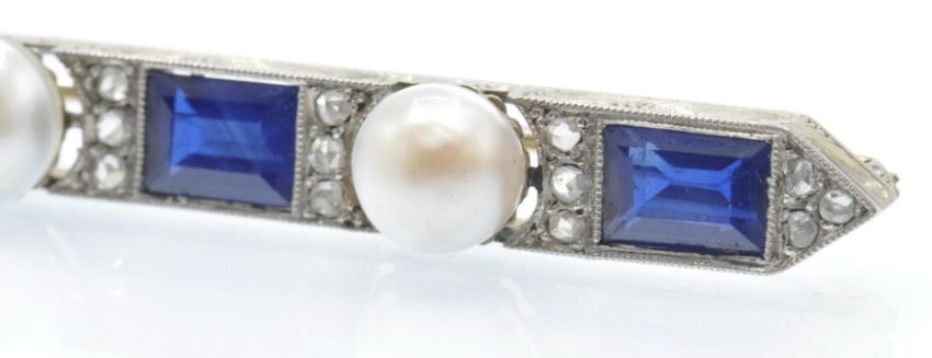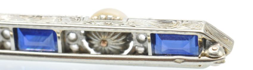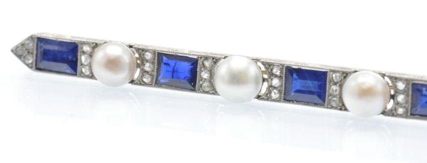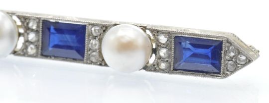 An antique gold platinum, sapphire diamond and pearl bar brooch. The  brooch having a scroll decorated boat shaped mount , set with four rectangular stepped cut sapphires flanked by rose cut diamond accents and three pearls. The brooch completed with trombone fastener. Sapphires measures approx 6.5mm x 5mm - observations indicate natural. Total measures 7.5cms long. Weight 9.9g.