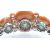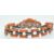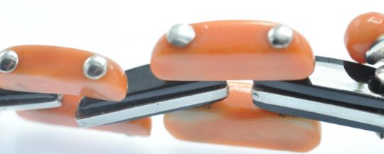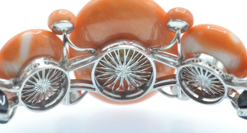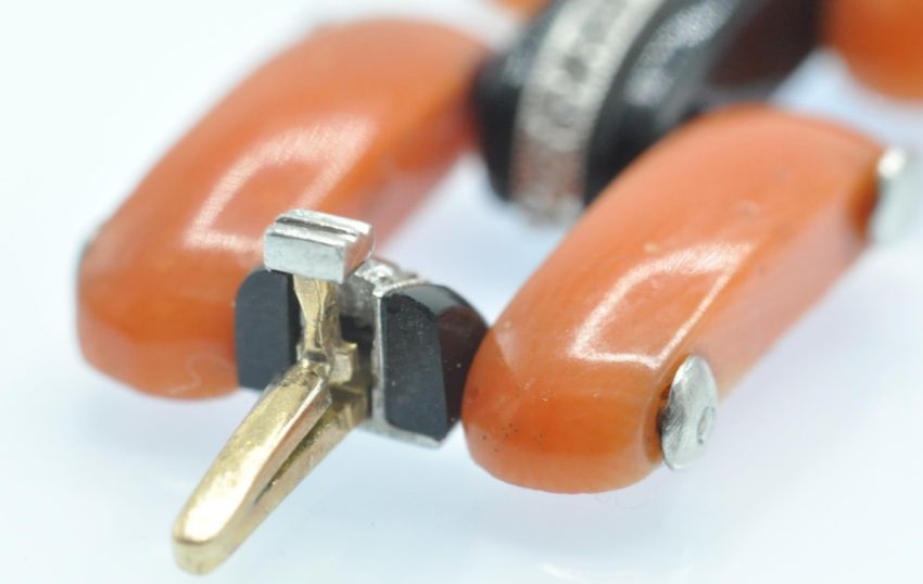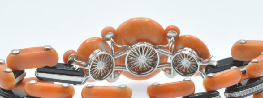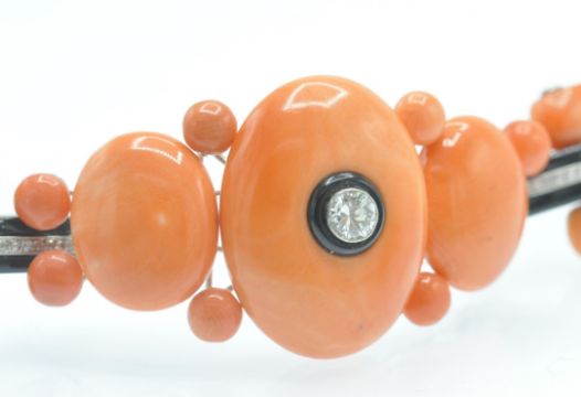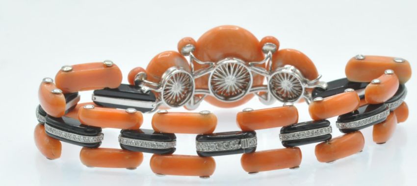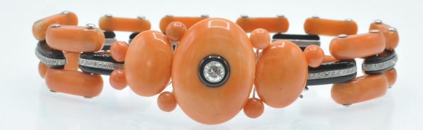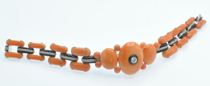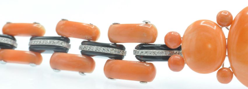 An Art Deco coral onyx and diamond bracelet. The bracelet having a central large precious coral cabochon set with a single round brilliant cut diamond in a platinum and onyx bezel mount, accompanied by further coral cabochons and diamond set onyx links to hidden clip clasp. Measures - Bracelet  7 1/4 inches. Largest coral cabochon approx 25mm x 18mm. Estimated principal diamond weight 0.30ct. Estimated total diamond weight 1.5ct.