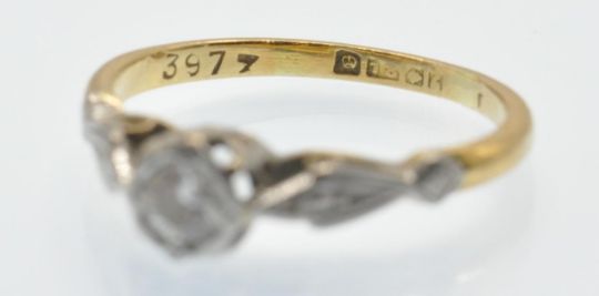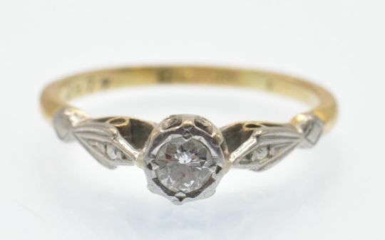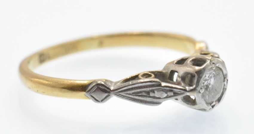 A hallmarked 18ct gold and diamond solitaire ring. The ring set with a single diamond in a raised pierced illusion setting having stylised shoulders.Estimated diamond weight 0.15ct  Weight 2.3g.  Size K.5 / 5.5/ 51.
