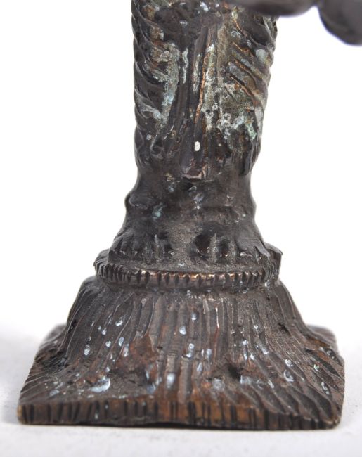 A late 19th Century Indian cast bronze figure in the form of the Hindu deity Nārada in a standing position playing the Vina with finely engraved detailing raised on textured base. Nārada is a famous Hindu travelling musician and storyteller, who carries news and enlightening wisdom. Measures 10cm x 3.5cm x 3.5cm.