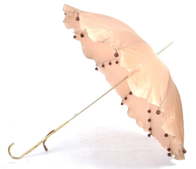 A fine 20th century ladies parasol. The shaft of brass construction, decorated with daisies and a small collar to the top. The parasol in brown, with decorative tasselling to the underside. Provenance; belonged to a nanny at Highclere Castle (location for Downton Abbey), likely whilst under Lord Canarvon ownership, and a fork with the family crest is also included by way of provenance. Measures approx; 85cm tall.