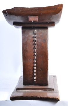 Tribal Antiquities - a large early 20th century African hardwood Ashanti tribal stool. Scalloped seat raised over a large circular support with carved central totem, standing on a flat carved base. Measures approx; 46cm tall.