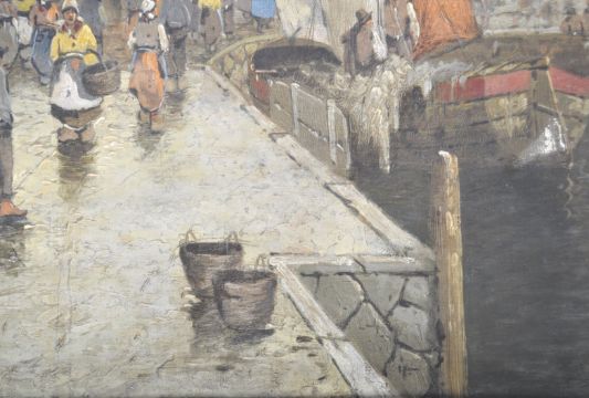 A 19th Century Dutch School antique oil on canvas painting depicting a coastal town / dock scene with figures shopping, rows of buildings and ships on a calm quays waters. Set to a period ornate gilt frame. Measures: 72cm x 97cm.