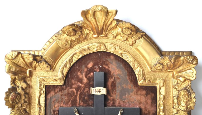 A rare 18th Century antique hand carved Dieppe ivory Corpus Christi set to a carved giltwood frame of same period. Depicts Christ set to ebonised Crucifix with INRI plaque above. Measures: 73cm x 46cm.