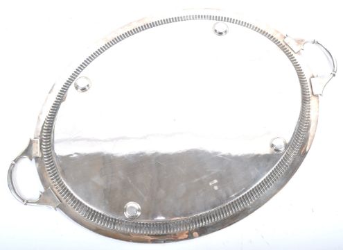 A stunning 19th Century Victorian English antique hallmarked silver 29" serving tray / meat platter by Richard Richardson, The tray of oval form having twin naturalistic open handles. Gadrooned edge with lightly engraved central panel. The central cartouche unengraved. Hallmarked for Sheffield 1897. Good clear hallmarks present. A piece of true quality. Measures: 74cm handle-handle. Weighs 4110 grams.