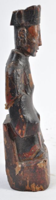 An 18th Century Chinese antique hand carved wooden figurine of an elder or memorial figure having remains of polychrome decoration with inset carved lozenge containing an early paper note. Measures: 26cm tall.