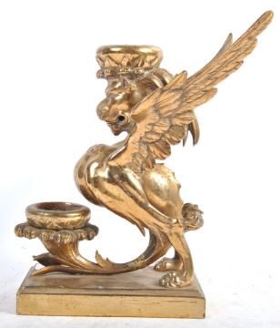 A 19th Century English antique Gothic revival brass candlestick in the form of the Mythical Beast Griffin. Gothic influences with twin sconces, one on head and the other to tail. Raised on plinth base. Measures: 25cm tall.