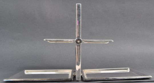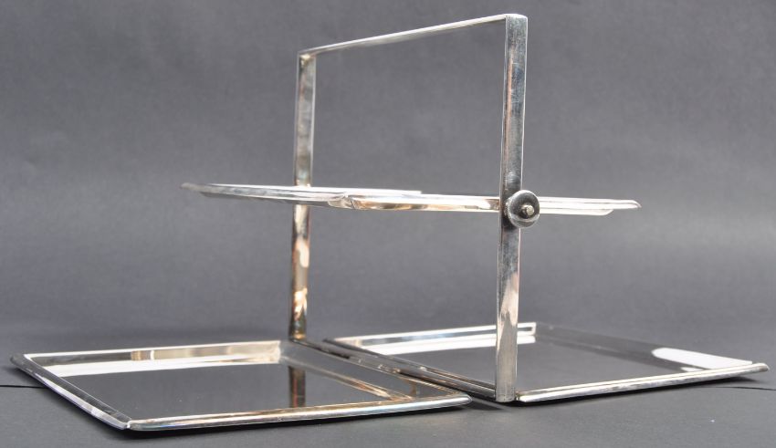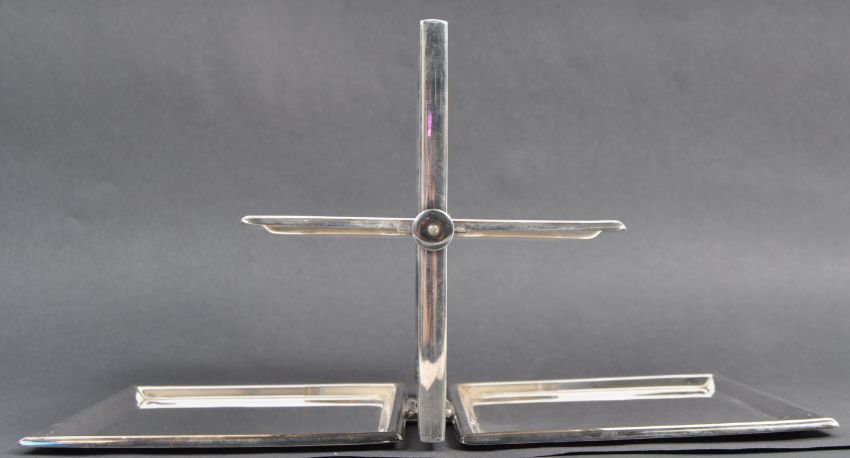 Dr Christopher Dresser - Hukin & Heath - Model 141 - A late 19th / early 20th Century English London antique silver plated metamorphic folding picnic tray / serving stand comprising of a rectangular frame with two fold out panels and central swivel panel. Complete fold into a single flat panel. H&H 141 impressed makers stamp to side. Measures: 17cm x 33cm x 20cm.