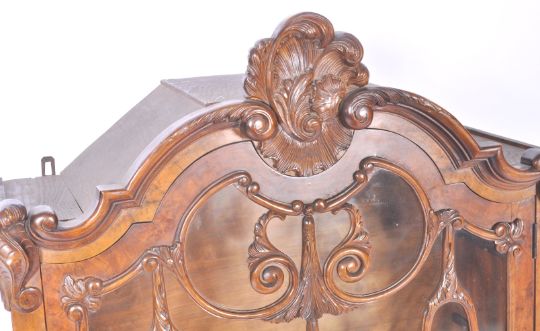 A high Victorian 19th century walnut hanging cabinet. The cabinet with carved, shaped apron having central full sized door with stunning astragal glazing. The cabinet with arched top having stunning carved scroll work crown and further carved detailing to the corners. Measures: 85cm x 86cm x 33cm.