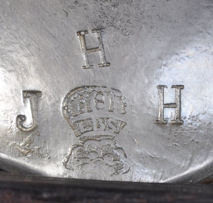 A 18th Century Dutch antique hand carved spoon rack having an arched pediment top  complete with a set of six pewter spoons with touch marks to bowls. Measures: 40cm long.