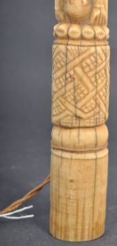 Tribal Antiquities - a collection of x3 antique 19th century African carved ivory and bone tusks, two likely a hippo tooth (or similar). The first being a carved (believed hippo) tusk, possibly a spear tip - depicting a single figure to the centre, the second an ivory tusk carved with several animals and figures with inset glass eyes ascending to the top figure (head missing), the third (smallest) carved with various figures leading to a kneeling figure to top. Interesting collection. Tallest measures approx; 28cm tall.