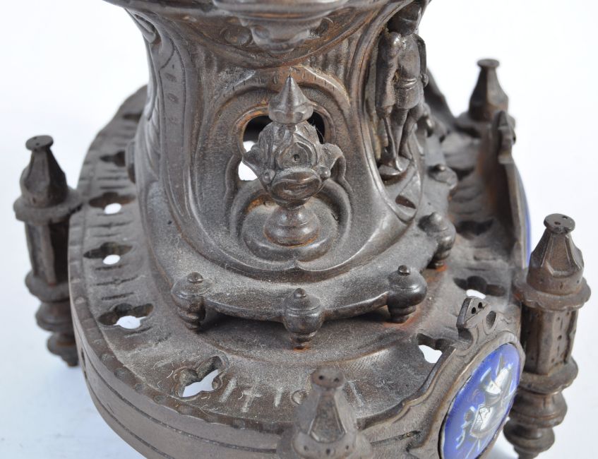 Leroy Et Fils of Paris - A 19th Century French antique mantel clock having a bronze / brass case with inset painted blue ceramic panels depicting classical knights with Roman numeral chapter ring and crown top. Measures: 34cm tall.