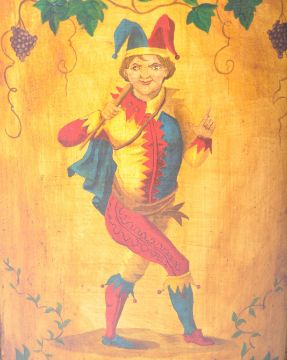 A rare and unusual 19th Century antique corner cupboard cabinet of bow fronted shape having hand painted depiction of a court jester to the door with further Medieval decoration. The sides of the cabinet set with carved fist columns. Door to front opens to reveal a shaped shelves interior. Measures: 76cm x 64cm x 40cm.
