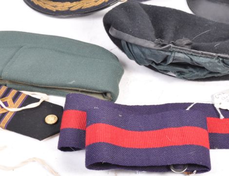 A collection of assorted British Forces (Army, Navy etc) caps and hats, to include; forage caps, berets, Fusiliers beret (named), stable belt, peaked cap etc. Interesting collection.