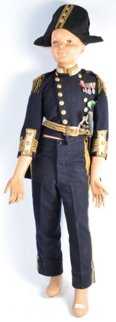 An incredible rare vintage pre-WWII Second World War related child's Royal Navy Officer's uniform. The uniform including a small-scale bi-corn hat, tunic (with faux medals), belt, dress sword and trousers. The uniform being an exact replica, complete with original Royal Navy buttons to front. Supplied upon a vintage mannequin. Incredibly well made uniform, and a wonderful display piece. Mannequin measures approx; 135cm tall.