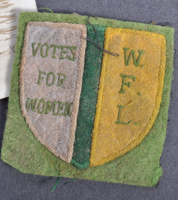 Suffragette interest - A pair of rare believed early 20th century WFL Women's Freedom League felt / cloth blazer patches / badges. The badges on green felt with a shield which reads ' Votes For Women ' to the left and ' WFL ' to the right. White and yellow panels respectively. Supplied with a personal real photographic postcard from the period, from the same collection. Further provenance sadly unknown. Interesting collection. The Women's Freedom League was an organisation in the United Kingdom which campaigned for women's suffrage and sexual equality. It was an offshoot of the militant suffragettes after the Pankhursts decide to rule without democratic support from their members. The group was founded in 1907 by seventy-seven members of the Women's Social and Political Union (WSPU) including Teresa Billington-Greig, Charlotte Despard, Alice Schofield, Edith How-Martyn and Margaret Nevinson. They disagreed with Christabel Pankhurst's announcement that the WSPU's annual conference was cancelled and that future decisions would be taken by a committee which she would appointThe group was founded in 1907 by seventy-seven members of the Women's Social and Political Union (WSPU) including Teresa Billington-Greig, Charlotte Despard, Alice Schofield, Edith How-Martyn and Margaret Nevinson. They disagreed with Christabel Pankhurst's announcement that the WSPU's annual conference was cancelled and that future decisions would be taken by a committee which she would appoint